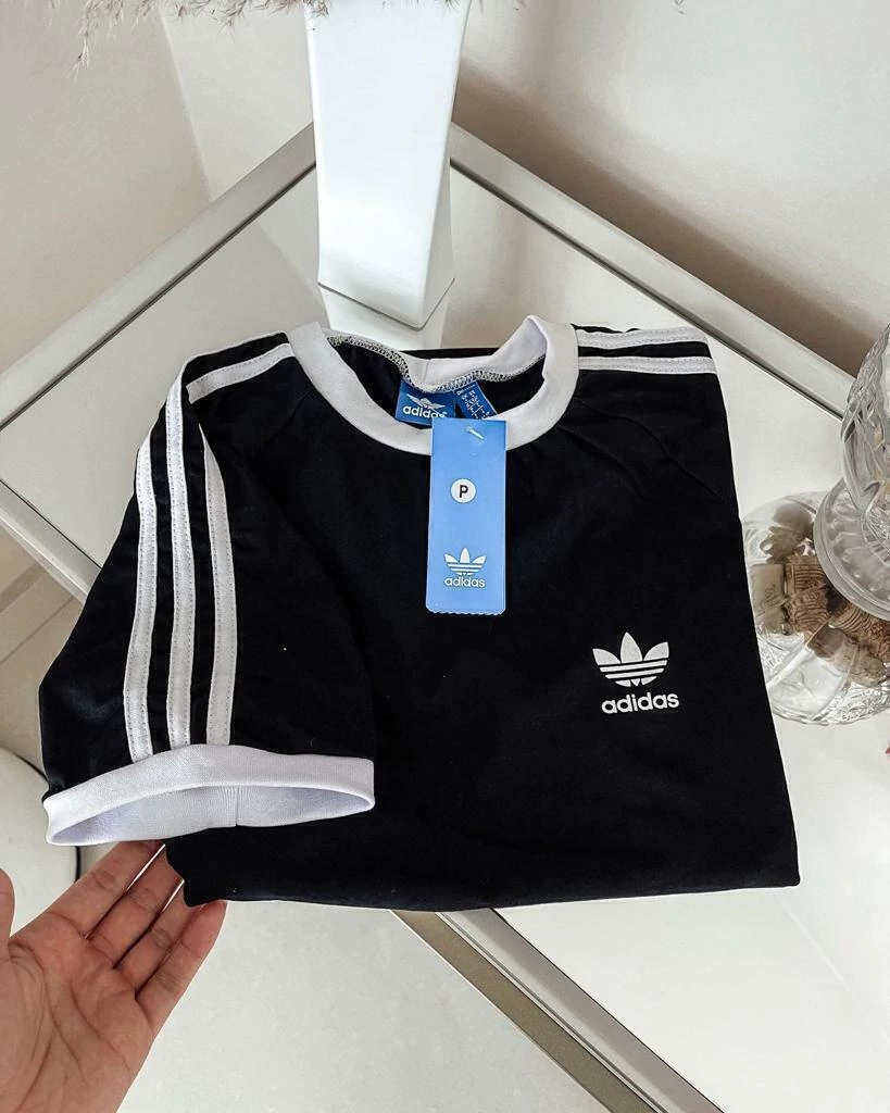 Logo: O logotipo da Adidas, com as icônicas três listras ou a versão "Trefoil" (o triângulo de folhas), geralmente aparece de forma proeminente no centro ou no peito da camiseta. O logo pode ser em um tom contrastante, como branco sobre preto ou vermelho.